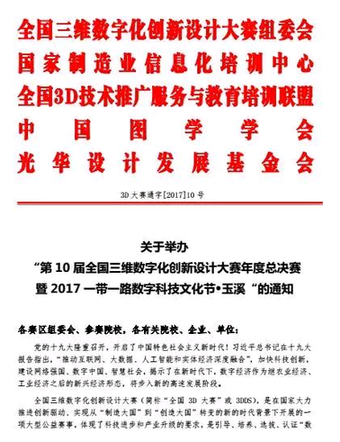 查看更多第10屆全國(guó)三維數(shù)字化創(chuàng)新設(shè)計(jì)大賽年度總決賽暨2017一帶一路數(shù)字科技文化節(jié)定于2017年12月6日至12月9日在云南省玉溪市盛大舉辦?!皵?shù)造杯”數(shù)字化創(chuàng)意設(shè)計(jì)與智能制造(3D打?。┐筚愖鳛橹骰顒?dòng)之一,將于12月6日-12月9日同期舉行。現(xiàn)將相關(guān)活動(dòng)具體安排通知如下: